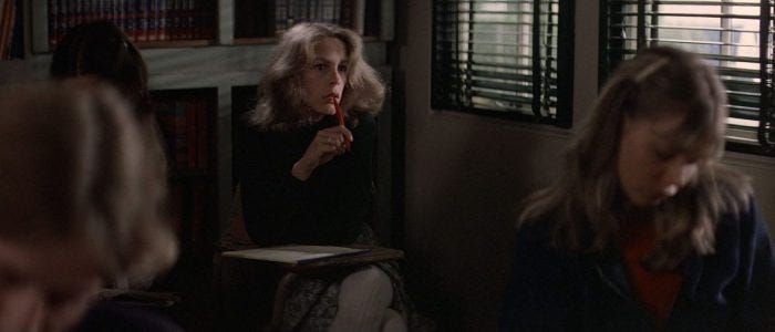 We’re being preached to here. We never see the teacher. The scene chooses to focus on Laurie the entire time. A disembodied voice, delivering a message, not a character engaging in dialogue.
